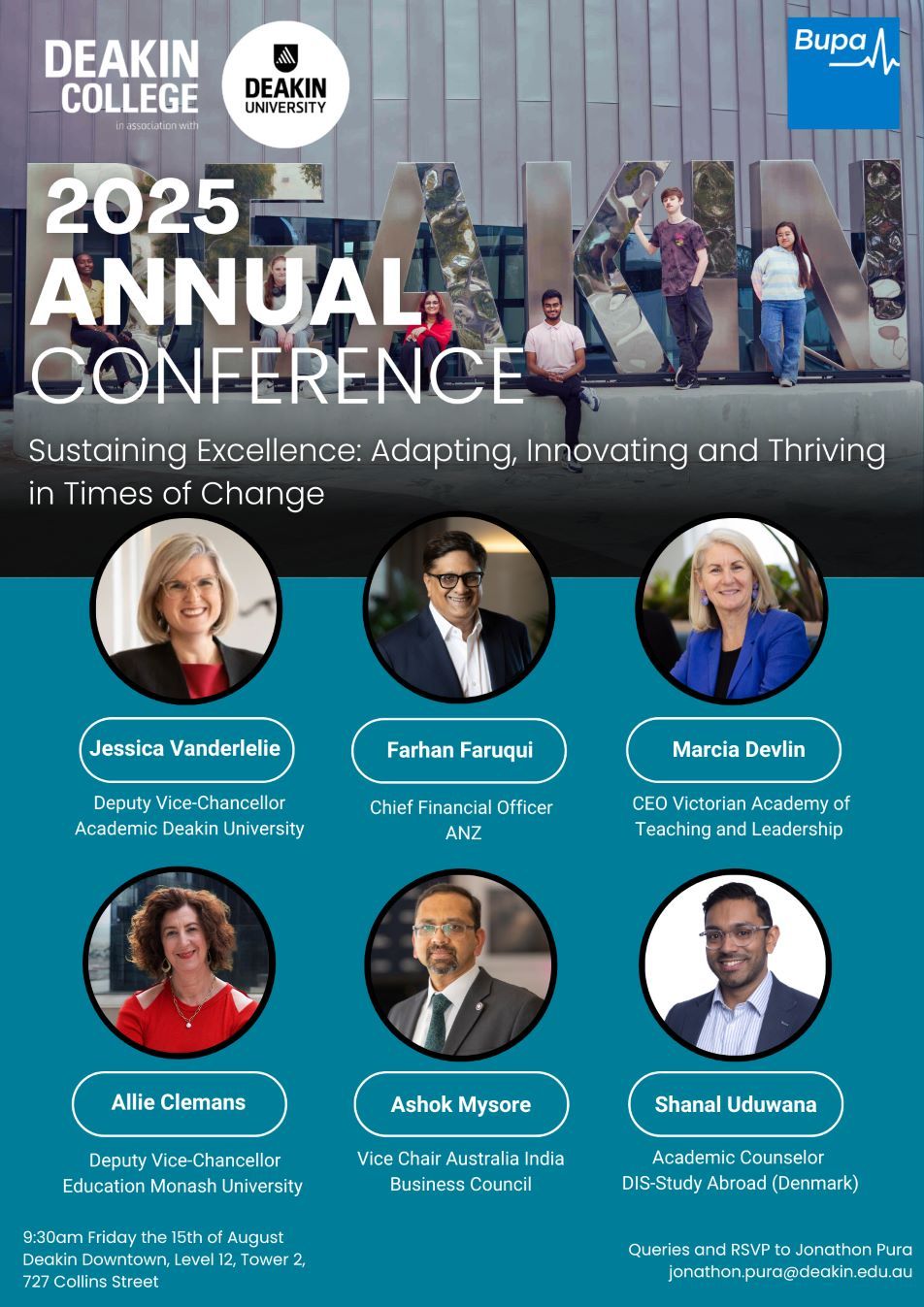 Deakin College, in collaboration with Deakin University and proudly supported by Bupa, will host the 2025 Annual Conference, themed “Sustaining Excellence: Adapting, Innovating and Thriving in Times of Change” in August 2025.